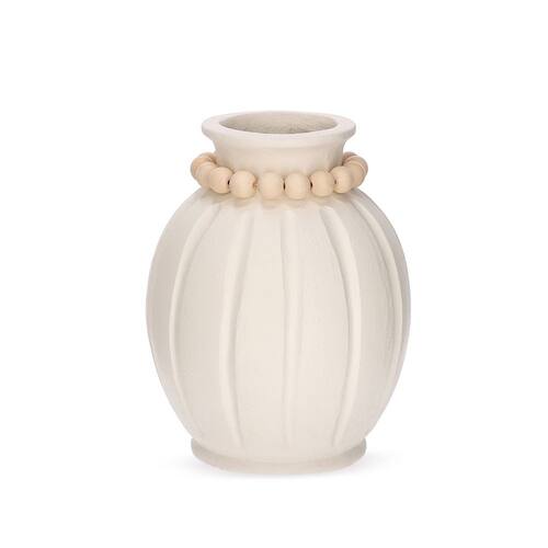 O Vaso Decorativo em Fibra de Vidro é uma peça charmosa e contemporânea, com acabamento fosco e detalhe de contas em madeira que agrega textura e personalidade. Seu design suave e elegante se adapta facilmente a diversos ambientes, trazendo leveza e sofisticação.