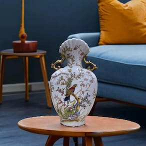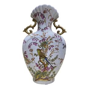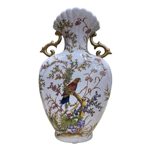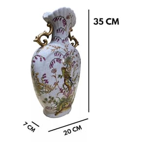 Vaso decorativo porcelana colorido bege pássaros 35x20 Este elegante vaso de porcelana bege é uma verdadeira obra de arte. Seu tom suave serve como um pano de fundo perfeito para os ricos detalhes coloridos que adornam sua superfície. Em cada um dos lados, um pássaro diferente é delicadamente retratado, trazendo vida e charme à peça; as cores vibrantes dos pássaros contrastam lindamente com o fundo neutro.
