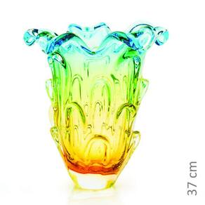 Vaso Em Cristal Murano Água Marinha E Âmbar São Marcos 37cm Vaso Em Cristal Murano Água Marinha E Âmbar - São Marcos é uma peça decorativa produzida 100% artesanalmente com a técnica secular e originária da Itália, a qual com muita maestria e criatividade são desenvolvidas e preservadas no brasil pela Cristais São Marcos desde 1962.