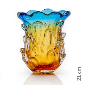 Vaso Em Cristal Murano agua Marinha E Ambar São Marcos Comprimento: 18cm Largura: 14cm Altura: 21cm Peso: 2540g Produzida 100% artesanalmente com a técnica secular e originária da Itália, a qual com muita maestria e criatividade são desenvolvidas e preservadas no Brasil pela Cristais São Marcos desde 1962. As escolhas das peças são versáteis e podem ser usadas para decorar casas e ambientes dos mais variados estilos. A tradição do Cristal Murano e a inovação em detalhes, formas e cores, trazem requinte para a decoração. O colorido do Murano em especial, torna-se um coringa na decoração e produzem um efeito muito bonito em locais com luz natural, não dependendo de nenhum outro elemento para se destacar. As peças em Cristal Murano, são atemporais, aposte nelas como a estrela da decoração ou ainda para harmonizar em combinações com diferentes artigos para compor um ambiente. Junto com as peças em Murano, leve ainda um pouco de história. Uma dica é misturar diferentes Muranos e criar sua coleção de arte particular. O cristal Murano, tornou-se objeto de desejo por suas características únicas. Sendo assim, com todas essas particularidades, ele é uma ótima escolha para decorar, colecionar e ainda presentear com classe e sofisticação. Ean: 7894728687666