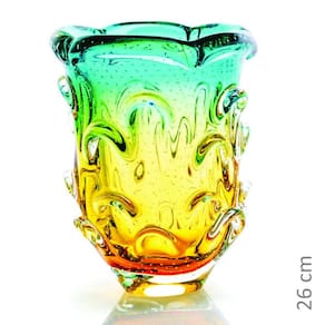 Vaso Em Cristal Murano Esmeralda E Âmbar - São Marcos é uma peça decorativa produzida 100% artesanalmente com a técnica secular e originária da Itália, a qual com muita maestria e criatividade são desenvolvidas e preservadas no brasil pela Cristais São Marcos desde 1962.