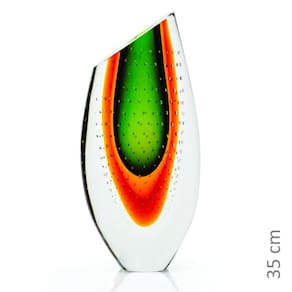 Vaso Em Cristal Murano Esmeralda E Âmbar - São Marcos 35cm Vaso Em Cristal Murano Esmeralda E Âmbar - São Marcos é uma peça decorativa produzida 100% artesanalmente com a técnica secular e originária da Itália, a qual com muita maestria e criatividade são desenvolvidas e preservadas no brasil pela Cristais São Marcos desde 1962.