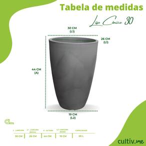 Vaso Liso Cônico 30 (20L) Preto Ardosia JAPI Descrição * Agregam um formato moderno e super versátil, que se encaixa em inúmeros ambientes, além de expandir as possibilidades de composição da linha. * O formato cônico confere sofisticação aos ambientes, além de possibilitar o desenvolvimento de plantas com raízes mais compridas