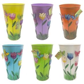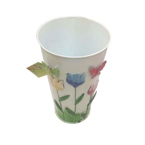 Este belo vaso de metal é um enfeite para jardim, casa, quintal, varanda, etc. Ao mesmo tempo que serve par guardar coisas dentro, como flores, jornais, também tem um design arrojado, com flores e borboletas em relevo na frente, pintados de maneira colorida. A durabilidade do material também é boa por ser feita em ferro, com bela pintura.