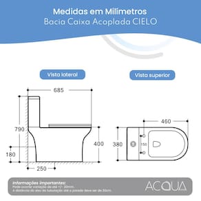 Assento Soft Close (fechamento suave) e Smart Click (remoção com um toque) Acabamento: Esmaltado Acompanha anel de vedação: Sim Acompanha assento: Sim Acompanha fixação: Sim Acompanha Manual de Instalação: Sim Altura: 79 cm Ambiente Principal: Banheiro Ambiente Recomendado: Área Comercial/Área Residencial Assento com fechamento suave: Sim codigo_ean: 7898777370074 Comprimento: 68,5 cm Cor: Branco Cor do Assento Sanitário: Branco Cor do Produto: Branco Cor Predominante: Branco Economizador: Sim Itens Inclusos: 1 Vaso Sanitário e Kit Ferragens Largura: 38 cm Linha: CIELO Linha ou Coleção: CIELO Manual de Montagem e Instalação: https://product-hub-prd.madeiramadeira.com.br/773149141/documents/0c806318-41bf-4f4b-b26d-cd5a32d43129a32fc9cb94058f521770749367.pdf Marca: Acqua Casa Material Principal: Porcelana Origem do Produto: Importado Peso: 60 kg Saída de esgoto: Vertical Tecnologia: Sifão 100% EsmaltadoDescarga RimlessAssento Soft Close/Smart Click Tipo de bacia com caixa: Bacia com caixa acoplada Tipo de sifão: Oculto Tipo de Vaso Sanitário: Vaso Sanitário com Caixa Acoplada Marca: Não Informado