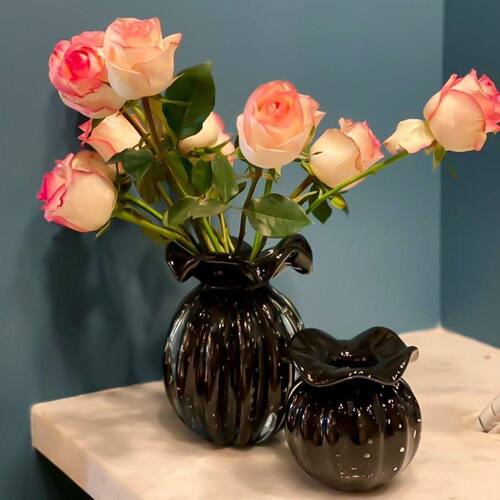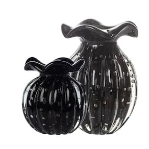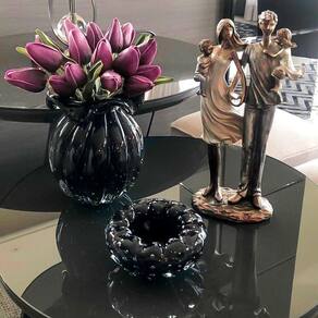 Vaso de Decoração Trouxinha Love, tamanho PP, na cor Preto, rigado com bolhas e bordas onduladas. Uma das peças mais clássicas quando fala-se em murano, as trouxinhas podem ser usadas nos mais diversos ambientes, como salas, quartos e banheiros. Combinam facilmente com bolas, gotas e pequenos cachepots. Harmonizam bem em mesas laterais, mesas de centro, pias de banheiros e, para um toque mais moderno, em cima de livros. Este produto é desenvolvido utilizando a técnica de murano, a qual o vidro é moldado por meio do sopro e movimentos manuais, um processo artístico totalmente artesanal, podendo ocorrer variações nas características de cores, modelagem e proporções em relação a imagem e a medida de referência.