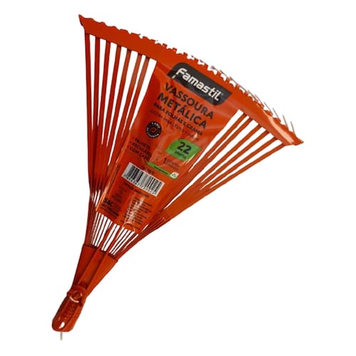 A Vassoura Metálica Famastil é ideal para varrição eficaz em quintais, gramados, calçadas e áreas externas. Equipadas com 22 dentes metálicos robustos, suas palhetas removem folhas secas, grama cortada e detritos com eficiência, sem danificar superfícies delicadas.