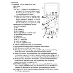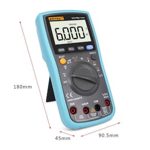 Proteções de 550V em faixas de resistência e capacitância. Grande tela LCD, display máximo 6000 contagens, a medição eficaz para corrente e tensão. indicação de baixa tensão e desligamento automático. medições de corrente 20A estão disponíveis. Tamanho pequeno e compacto, economia de espaço e portátil para transportar.