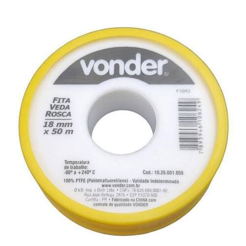 DETALHES TÉCNICOS Largura x comprimento da fita veda rosca: 18 mm x 50 m Cor da fita veda rosca: Branca Material da fita veda rosca: 100% PTFE Politetrafluoretileno Temperatura de trabalho da fita veda rosca: 90 a + 240 c Marca: Não Informado Ean: 7893946106249