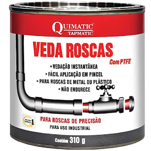 O Veda Rosca com Teflon veda água, soluções aquosas (neutras, ácidas ou cáusticas) e gases comuns, como: GLP, ar comprimido, nitrogênio, gás carbônico, vapor e vácuo. Não use com oxigênio e em temperatura de ignição: 440C. Fácil aplicação com pincel, não endurece.