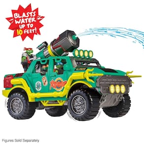 - Ride In Style: The Sewer Spewer serve para toda a equipe Turtle, com assentos dentro do veículo e espaço para ficar na caçamba do caminhão