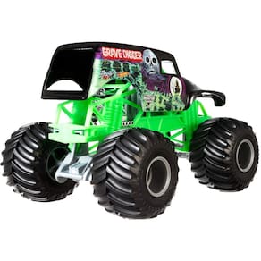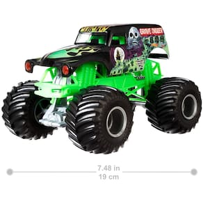 Veículo fundido Hot Wheels Monster Jam Grave Digger, escala 1:24, preto e verde — Com designs ainda mais precisos, este caminhão de escala 1:24 é feito com peças duráveis de metal fundido sob pressão e decorado exatamente como sua inspiração voadora, esmagadora e superdimensionada. - Suas rodas monstruosas também estão prontas para terrenos mega difíceis! . - Pegue os outros veículos do sortimento e vá até a arena Monster Jam para uma batalha frente a frente! Quem dominará e quem será destruído