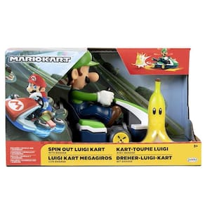 O Veículo Mario Kart Spin Out é perfeito para você recriar sua própria corrida! Ele é uma réplica do jogo Mario Kart!! Acompanha acessório de casca de banana e um carrinho que pode ser do Luigi ou do Mario. Para brincar, dê corda no carrinho, mas tome cuidado com a banana, ao bater nela, ele gira. A brincadeira ficará muito mais legal com o Mario Kart Spin Out!