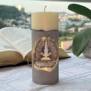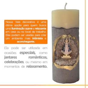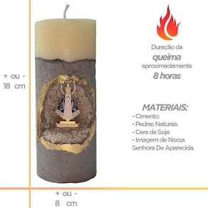 A Vela Decorativa Nossa Senhora De Parecida tem aproximadamente 18cm de altura, 8cm de diâmetro e pesa cerca de 1kg. Ela é feita com materiais de alta qualidade, como cimento, cera de soja, pedras naturais e uma imagem de Nossa Senhora de Aparecida.