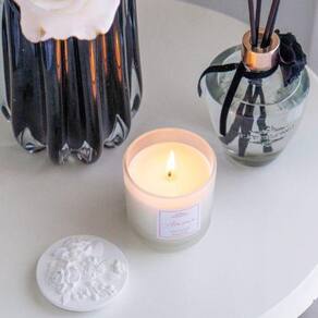 SOBRE A VELA: Peso 180g; Duração aproximadamente 30 horas; Vela aromática em pote de vidro reutilizável; Tampa de gesso; Pavio 100% algodão, Blend de ceras naturais.