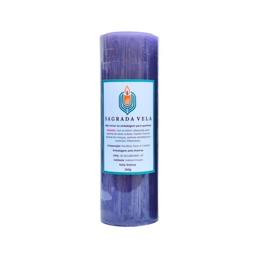 Vela Votiva de 7 Dias 100% Parafina - Fabricação Própria. Contém 1 unidade.Cor: Roxa. Peso: 260 gramas. Altura: 15 cm. Diâmetro: 50 mm. Composição: Parafina, Corante e Pavio. Validade: Indeterminada. Marca: SAGRADA VELA. *Atenção: Plástico Anti-Chamas, NÃO retirar para acender. *Segurança: evite acidentes, utilize sempre um castiçal ou suporte próprio para velas. *Duração: 7 dias. As condições de queima podem alterar conforme o ambiente ou corrente de ar, portanto é indicado acender em local arejado e longe do alcance de crianças, animais domésticos e produtos inflamáveis. Como se trata de um produto artesanal, podem existir pequenas variações nas cores das velas. Embalamos cuidadosamente para o transporte. Imagem meramente ilustrativa. Marca: Não Informado