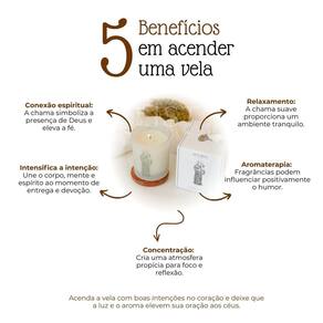 Vela Santos Modelo: Santo Antônio Vela Aromática dos Santos - Ilumine Sua Fé e Transforme Seu Ambiente Cada vela da linha Santos é uma experiência única que acende sua fé e traz uma atmosfera de paz e devoção para o seu lar. Escolha a vela que mais toca seu coração e permita que a luz dos santos ilumine seus dias, criando um ambiente cheio de tranquilidade e espiritualidade. No verso de cada vela, você encontra uma oração do santo, que fortalece sua conexão espiritual. Além disso, cada vela acompanha uma medalha com a imagem do santo escolhido, tornando-a um presente especial e significativo. Benefícios: