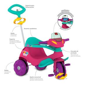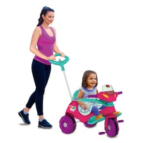 Funcao passeio: O adulto utiliza a haste direcionavel para conduzir o triciclo. Basta, colocar o cercado de protecao e o apoio dos pes.
