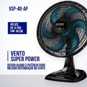 Vent 40Cm Mondial Super Power Vsp-40-Ap - 4412-02 Preto/Azul 220 Volts MarcaMondialModeloSuper Power- VSP-40-APTipoVentilador de mesaDiâmetro40 cmPás6 pásVelocidades3 velocidadesAcionamentoManualNível de ruídoBaixoRepelenteNãoLumináriaNãoTimerNãoPotência140 WAltura62,5 cmLargura45 cmProfundidade32 cmPeso2,45 kgCódigo de barras110V: 7899882314236 | 220V: 7899882314243Garantia01 ano 3 meses de garantia legal e mais 9 meses de garantia especial concedida pelo fabricante . Conteúdo da embalagem01 Ventilador e manual de instruções Ean: 7899882314243