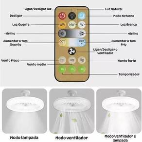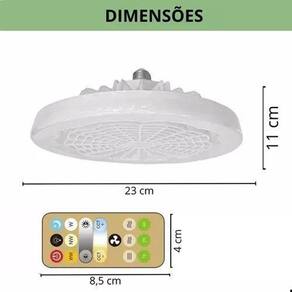 Ventilador de Teto LED com Controle Remoto Tamanho: 23x11 cm de diâmetro Material: Plástico resistente Voltagem: 85-265V BIVOLT Frequência: 50/60Hz Especificações do suporte da lâmpada: E27 Fonte de luz: luz LED
