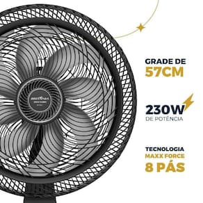 Com classificação energética A, o Ventilador 2 em 1 Britânia alia potência e economia. O motor com fusível térmico de segurança, o porta-fio e a alça na grade traseira reforçam a praticidade e a segurança durante o uso. Eficiência, flexibilidade e conforto em um só produto: Ventilador 2 em 1 Britânia Maxx Force 8 Pás 230W BVT50T.