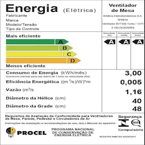 MOBILAR ELETRO HÁ MAIS DE 25 ANOS INOVANDO EM PRODUTOS E VENTILADOR Britânia 40CM TURBO 6 PAS Ventilador Britânia BVT4000 tem 130W de potência e 3 velocidades para você refrescar e jogar o calor pra longe. O Sistema oscilante permite melhor do ar no ambiente deixando o ar mais fresco e agradável para dias ou noites mais tranquilas. 3 velocidades; Hélice de 6 pás de 40cm; Grade que obedece às normas de ( com partes móveis); Oscilação horizontal automática com sistema de acionamento (botão integrado à carcaça); Sistema de articulação para ajuste da inclinação vertical sistema de travamento entre grade frontal e traseira; Remoção da grade frontal somente com uso de ferramenta, conforme normas de ; Motor com fusível térmico de ; Especificações Altura61,00cm Largura47,50cm Profundidade32,50cm Peso2,64Kg