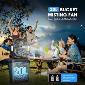- 💧?Balde portátil de 5 galões?: diga adeus aos ventiladores externos volumosos e que consomem espaço! Nosso ventilador de nebulização portátil pode ser virado e armazenado no balde, para facilitar o transporte. O grande tanque de água de 20 L fornece de 8 a 10 horas de pulverização contínua (o dobro da capacidade de outros ventiladores de nebulização de balde). Mais adequado para atividades ao ar livre, como golfe, praia e itens essenciais para acampar. Além disso, a parte inferior da caçamba é equipada com rodas universais, o que aumenta a portabilidade em 100%.