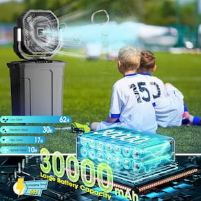 - 🔋?30000mAh e vento de 4 velocidades?O ventilador recarregável pode funcionar continuamente por 7 a 62 horas após 6 horas totalmente carregado com o adaptador de carregamento rápido. Perfeito para longas horas de trabalho ao ar livre ou férias. O ventilador mister é acionado por um motor sem escova de alta potência e tem 4 configurações de velocidade diferentes, de brisa a vento forte, para atender às suas diferentes necessidades.
