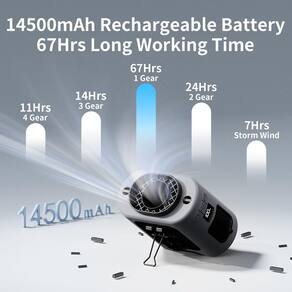 - ?Tempo de funcionamento duradouro?O ventilador de cintura portátil pode funcionar continuamente por até 67 horas em baixa velocidade. Leva 6,5 horas para carregar totalmente e suporta o carregamento durante o uso. A velocidade máxima do vento persiste por 8 horas, enquanto a velocidade mínima do vento pode durar até 67 horas, ajudando você a vencer o calor durante todo o dia (não são vendidas baterias de lítio independentes com o produto)