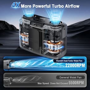 - ?Resfriamento 4x mais potente? – Ventilador de cintura portátil Wavmill atualiza fluxo de ar turbo de 22000 RPM e motores duplos, proporciona **100% mais força do vento** e **o dobro do volume de ar** do que os ventiladores de cintura normais. Se você estiver trabalhando, caminhando ou fazendo jardinagem ao ar livre, fique **fresco e imparável** em qualquer calor!