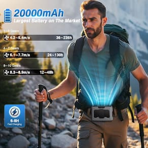 - ?Resfriamento máximo de 235 horas ? – Ventilador de cintura recarregável equipado **Bateria ampliada de 20.000 mAh** alimenta até **235 horas no máximo** de resfriamento e carregamento rápido em apenas **6 horas**, mantendo você atualizado o dia todo!