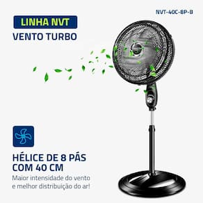 Vento turbo: O nvt vento turbo possui hélice com 8 pás e 40cm de diâmetro. O design aerodinâmico e de alta performance proporciona maior intensidade do vento e melhor distribuição de ar. O resultado é um ambiente mais fresco e arejado!