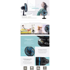 Ficha Técnica: Diâmetro: 30cm Altura: 49cm Profundidade: 24cm Largura: 35cm É silencioso: Sim Com oscilação: Sim Peso: 1.53 kg Fabricante: Cadence Tipo de ventilador: De mesa Potência: 50W Quantidade de velocidades: 3 Cor da estrutura: Preto Cor das pás: Azul Quantidade de pás: 6 Material da grade: Plástico Com grade removível: Sim Com inclinação: Sim