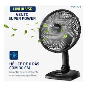 Descrição O Ventilador de Mesa Mondial VSP-30-B é um equipamento confiável e prático para garantir um ambiente mais fresco e agradável nos dias quentes. Com sua potência e eficiência, proporciona um fluxo de ar constante e refrescante, enquanto seu design compacto e seu modelo de mesa permite que seja facilmente posicionado ou transportado para qualquer espaço de forma rápida e fácil. CARACTERÍSTICAS: - Potência e eficiência para um fluxo de ar constante e refrescante - Design compacto e versátil, adequado para diferentes ambientes - Operação silenciosa para um ambiente tranquilo - Inclinação ajustável para direcionar o fluxo de ar conforme necessário ESPECIFICAÇÕES TÉCNICAS: Marca: Mondial Cor: Preto Modelo: VSP-30 Voltagem: 110V Potência: 60W Velocidades: 3 Diâmetro da Hélice: 30cm Número de pás: 6 Oscilante: Sim Tipo: Ventilador de Mesa DIMENSÕES: Altura: 49cm Largura: 35cm Comprimento: 24,5cm Peso: 1,670kg DICA DO MINEIRINHO: Posicione o Ventilador em uma superfície estável e nivelada para garantir seu funcionamento adequado e seguro. DÚVIDAS FREQUENTES: - Qual é a potência deste ventilador? A potência do Ventilador é de 60W, proporcionando um desempenho eficaz e econômico. - Como limpar este ventilador? Para limpar, desligue-o e desconecte da tomada. Use um pano macio e seco para limpar as pás e a grade. Evite o uso de água ou produtos químicos. - É possível ajustar a inclinação do ventilador? Sim, a inclinação do ventilador pode ser ajustada para direcionar o fluxo de ar conforme necessário. - O ventilador é silencioso? Sim, este ventilador opera de forma mais silenciosa para proporcionar um ambiente tranquilo e agradável. ITENS INCLUSOS: 01 Ventilador de Mesa Mondial VSP-30 01 Manual de Instruções