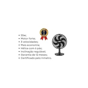 INFORMAÇÕES TECNICAS: - Ventilador de mesa; - Certificação Inmetro; - Motor Forte; - Hélice 6 pás; - Frequência 60HZ; - Potência 80W; - Três velocidades; - Inclinação regulável; - Fabricado no Brasil;