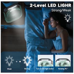 Este ventilador recarregável pode ser configurado para desligar após 1, 3, 5 horas. Este é um recurso doce. Quando você precisa de uma brisa para dormir. Este é um ventilador de mesa com luz LED. Existem dois tipos de brilho que podem ser ajustados. Pode ser como uma luz noturna durante o sono. A iluminação também pode ser fornecida ao acampar ao ar livre. é uma função muito útil. Como um ventilador operado por bateria. O ventilador de mesa tem uma bateria de 10000mAh. O tempo de trabalho pode chegar a 6 72 horas. Com interface de alimentação USB. Quando você estiver acampando ao ar livre ou enfrentando uma queda de energia. Pode ser como fonte de alimentação de emergência. Configurações de velocidade do vento de 4 velocidades, você pode escolher modos de fluxo de ar baixo, médio, alto e forte de acordo com diferentes necessidades. A rotação de 180 permite que o ventilador de mesa forneça fluxo de ar ajustável. O ventilador tem cerca de de diâmetro