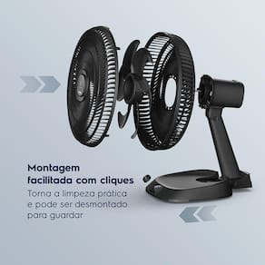 Seu design inteligente foi pensado para trazer praticidade ao dia a dia. A montagem com cliques permite desmontar facilmente para limpeza ou armazenamento. Além disso, o ventilador conta com ajuste de inclinação vertical e botão para sistema oscilante, proporcionando total controle da direção do vento.