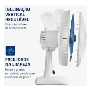 Especificações: Voltagem: 220V Potência: 60W Cor: Branco 3 Velocidades 6 Pás Inclinação regulável Sistema Oscilante Contínuo Baixo ruído Grade frontal removível Alça de transporte e porta-fio Diâmetro: 30cm Dimensões: 51x35x28 cm (AxLxP)