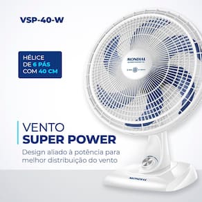 Com 40cm e 3 velocidades, o Ventilador de Mesa Mondial 6 Pás Super Power VSP-40-W garante vento mais forte. Ele tem baixo nível de ruído, sistema oscilante lateral, inclinação vertical regulável, além ser compacto e ter baixo consumo. Sua hélice tem design aerodinâmico, o que proporciona um vento forte.