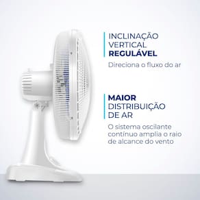 Como ele faz menos barulho, com qualquer uma das 3 velocidades, você dorme com ventinho e silêncio garantidos. Para ambientes mais amplos, você pode usar seu sistema oscilante. Já sua inclinação vertical regulável direciona o fluxo de ar para cima ou para baixo.