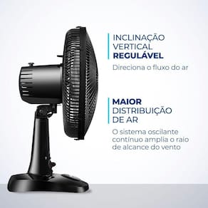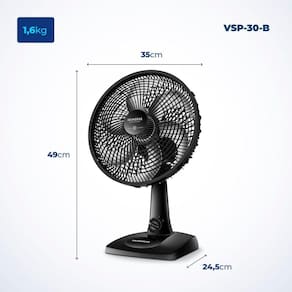 Ventilador De Mesa Mondial - 06 Pás - Vsp-30-b Vent 30cm Vsp-30-b 220v/60hz Super Power Com 30cm e 3 velocidades, o Ventilador Mondial Super Power VSP-30-B é mais vento. Ele tem baixo nível de ruído, sistema oscilante lateral, inclinação vertical regulável, além ser compacto e ter baixo consumo. Sua hélice tem design aerodinâmico, o que proporciona um vento forte. Como ele faz menos barulho, em qualquer uma das 3 velocidades, você dorme tranquilamente. Para ambientes mais amplos, você pode usar o sistema oscilante. A inclinação vertical regulável direciona o fluxo de ar para cima ou para baixo. Como a grade frontal é removível, ele ainda é fácil de montar e desmontar para limpeza. Ele também é fácil de carregar porque tem uma alça para . Já a base antiderrapante traz mais . Tudo isso com 01 ano de garantia. Modelo - VSP-30-B Cor - Preto Voltagem (Tensão) - 127V/220V Itens inclusos - 01 Ventilador; Manual de Instruções. Potência - 60W Dimensões do produto - 51cm x 35cm x 28cm (AxLxP) de velocidades - 03 velocidades Quantidade de pás - 06 pás Controle remoto - Não Coluna ajustável - Não Tipo de ventilador - Ventilador de Mesa Peso - 1,600kg Inclinação regulável - Sim Oscilante - Sim, lateral Garantia - 01 ano Ean: 7899882313840