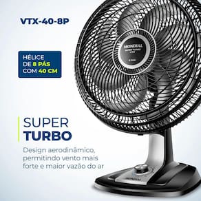 Para manter qualquer ambiente arejado e fresco nos dias mais quentes de verão, o seu companheiro perfeito é o Ventilador de mesa VTX-40-8P da Mondial. Ideal para quem deseja mais vento e ao mesmo tempo menos barulho, ele tem 140W de potência, 8 pás que permitem grande vazão de ar com 20% mais vento e 3 velocidades. Além do baixo consumo de energia é super prático para limpeza, já que sua grade de 40cm de diâmetro é removível. O ventilador da Mondial possui alça de transporte e porta fios, e possibilita o direcionamento do vento para onde você quiser com a regulagem de altura e inclinação vertical. Silencioso, faz menos barulho, proporcionando bem-estar para toda a família.