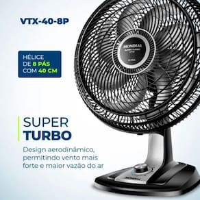 O Ventilador de Mesa Super Turbo VTX-40-8P possui 40 cm de diâmetro e hélice de 8 pás, o que promove uma circulação de ar mais eficiente e garante mais frescor ao ambiente.O sistema de ventilação alia a potência para refrescar ao baixo nível de ruído, proporcionando o silêncio necessário para momentos de concentração e uma excelente noite de sono.