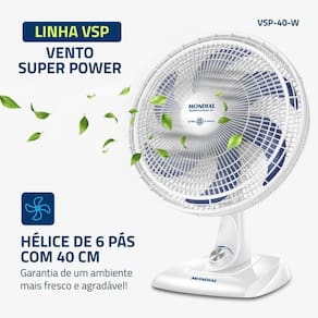 O Ventilador de Mesa Mondial Super Power VSP-40-W e a escolha perfeita para quem busca conforto e eficiencia durante os dias quentes. Com um design robusto e eficaz, possui 40cm de diametro e 6 pas que garantem uma distribuicao de ar ampla e uniforme em qualquer ambiente. Equipado com 3 velocidades ajustaveis, permite adequar o fluxo de ar conforme a necessidade, proporcionando um ambiente mais agradavel. Seu funcionamento silencioso torna-o ideal para uso em escritorios, salas e quartos, garantindo frescor sem perturbar. O Ventilador de Mesa Mondial Super Power VSP-40-W e a combinacao perfeita de potencia, eficiencia e conforto para o seu dia a dia.