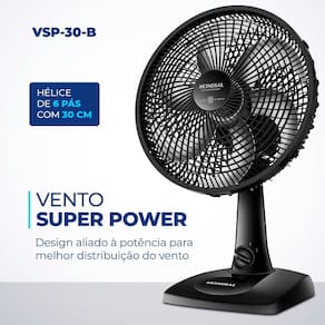 O ventilador Super Power VSP-30-B possui 30 cm de diâmetro e hélice com 6 pás, garantindo um ambiente mais refrescante e agradável. O Sistema Oscilante Contínuo amplia o raio do vento no ambiente e a Inclinação Vertical Regulável é perfeita para o direcionamento do fluxo de ar. Saiba mais sobre o VSP-30-B.