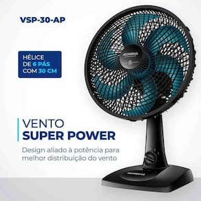 MOBILAR ELETRO HÁ 30 ANOS INOVANDO EM PRODUTOS E VENTILADOR DE PISO OU BANCADA MONDIAL SILENCIOSO 6 PAS TURBO Com 30 CM e 3 VELOCIDADES, o Ventilador branco Super Power VSP-30-AP é mais vento. Ele tem BAIXO NÍVEL DE RUÍDO, SISTEMA OSCILANTE lateral, INCLINAÇÃO VERTICAL REGULÁVEL, além ser compacto e ter baixo consumo. Sua HÉLICE TEM DESIGN AERODINÂMICO, o que proporciona um vento forte. Como ele faz MENOS BARULHO, com qualquer uma das 3 VELOCIDADES, você dorme com ventinho e silêncio garantidos. Para AMBIENTES MAIS AMPLOS, você pode usar seu SISTEMA OSCILANTE. Já sua INCLINAÇÃO VERTICAL REGULÁVEL DIRECIONA O FLUXO DE AR para cima ou para baixo. Como a GRADE FRONTAL É REMOVÍVEL, ele ainda é FÁCIL DE MONTAR e desmontar para limpeza. Ele também é FÁCIL DE CARREGAR porque tem uma alça para . Já a BASE ANTIDERRAPANTE traz mais . O Ventilador 30cm Super Power VSP-30-AP foi desenvolvido para USO DOMÉSTICO, sendo melhor para uso residencial. Tudo isso com 1 ANO DE GARANTIA MONDIAL. A Mondial é a escolha de milhões de consumidores. Cor Preto/Azul Voltagem (Tensão) Preto/Azul Petróleo Itens inclusos 01 Ventilador e 01 Manual de Instruções Potência 60W Dimensões do produto 51,00x35,00x28,00 de velocidades 3 Quantidade de pás 6 Coluna ajustável * Tipo de ventilador Ventilador de mesa Peso 1,60 Inclinação regulável Sim Oscilante Sim Garantia 1 Ano