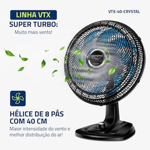 O Ventilador de Mesa Super Turbo VTX-40-Crystal possui 40 cm de diâmetro e hélice de 8 pás, o que promove uma circulação de ar mais eficiente e garante mais frescor ao ambiente. O sistema de ventilação alia a potência para refrescar ao baixo nível de ruído, proporcionando o silêncio necessário para momentos de concentração e uma excelente noite de sono.