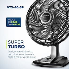 O Ventilador de Mesa Super Turbo VTX-40-8P da Mondial possui 40 cm de diâmetro e hélice de 8 pás, o que promove uma circulação de ar mais eficiente e garante mais frescor ao ambiente. Além disso, possui controle de velocidade com 3 variações, Máxima Turbo, Média Conforto e Mínima Silencioso. Aproveite a qualidade que só a Mondial oferece!