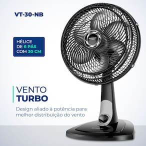 O Ventilador de Mesa Turbo VT-30-NB possui 30 cm de diâmetro, hélice com 6 pás e um design aerodinâmico que garante um ambiente mais fresco e arejado. Já o sistema de ventilação da Mondial apresenta baixo nível de ruído e assegura o silêncio necessário para momentos de concentração e uma excelente noite de sono.