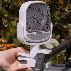 O mini ventilador possui dois jatos de resfriamento umidificante. Proporcionando um ambiente mais fresco. Além de ser giratória, podendo mover para qualquer lado que precisar.